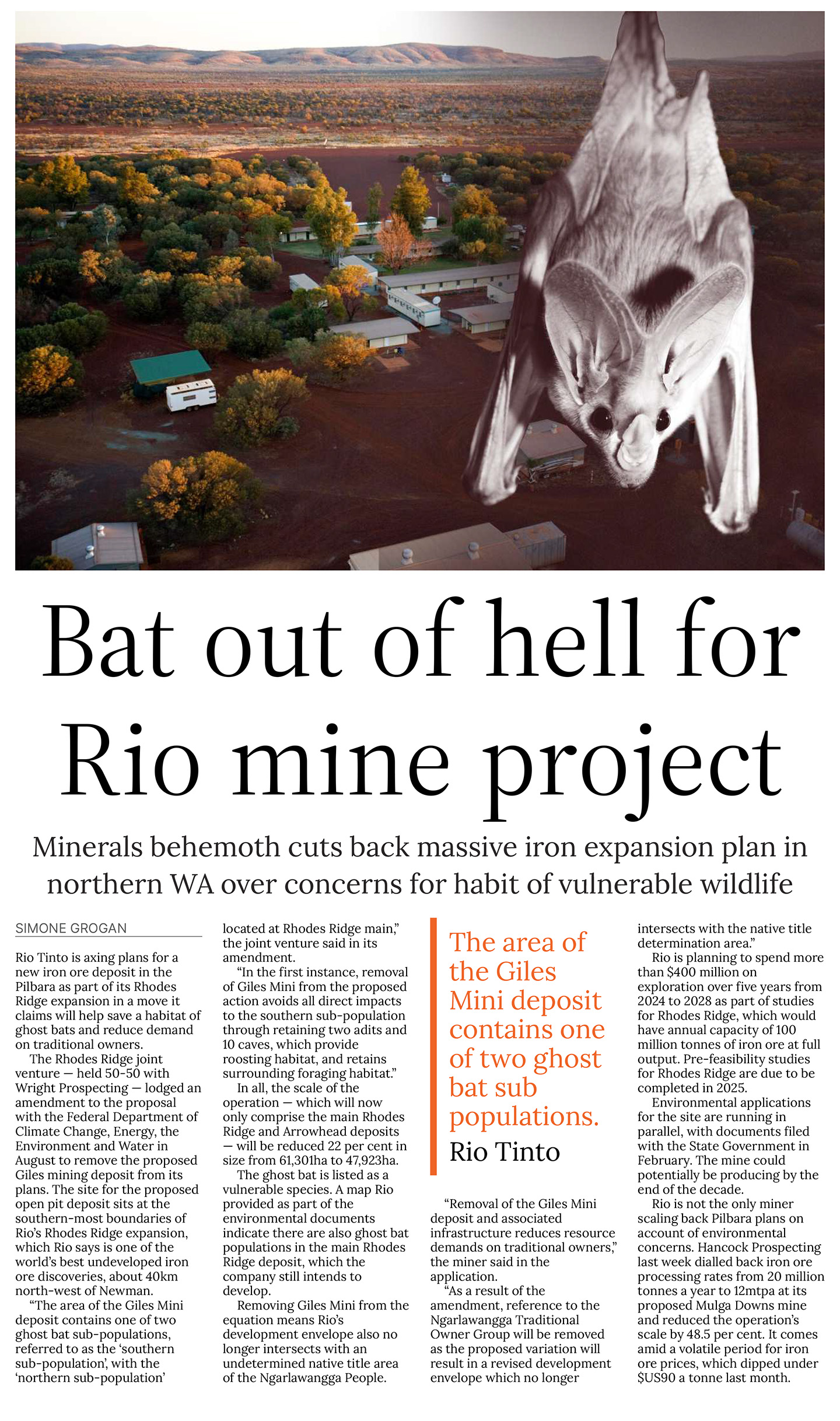 The ghost bat is listed as a vulnerable species. A map Rio provided as part of the environmental documents indicate there are also ghost bat populations in the main Rhodes Ridge deposit, which the company still intends to develop.