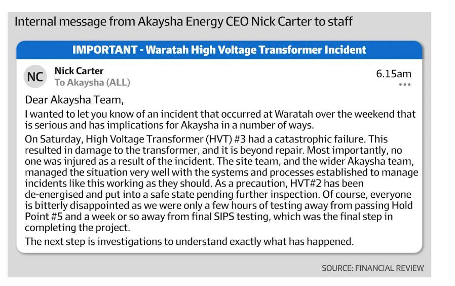The $1 billion Waratah super battery is being built by Akaysha Energy on the site of the former Munmorah coal power station near Budgewoi. An internal memo sent by the chief executive of the BlackRock-owned business, Nick Carter, says the transformer suffered a “catastrophic failure” last month.