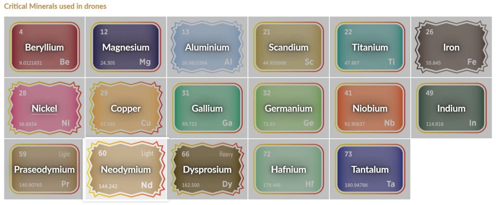 Drones have emerged as vital tools across diverse sectors, from agriculture and logistics to military and environmental monitoring, revolutionising how critical operations are conducted globally. Central to drone innovation and performance are critical minerals, essential materials underpinning structural integrity, efficient propulsion, reliable communication, precise navigation, and robust landing capabilities. Critical minerals such as aluminium, titanium, magnesium, and scandium form the structural backbone of drones, delivering the essential strength-to-weight characteristics necessary for endurance, durability, and optimal performance in demanding conditions. Advanced drone engines and propulsion systems rely heavily on materials like nickel, hafnium, and copper, providing thermal resilience and efficiency under extreme operational stresses and temperatures. Communication, electronics, and precise navigation systems depend on specialised materials like beryllium, gallium, germanium, and indium, whose unique properties ensure reliability, accuracy, and operational effectiveness. Furthermore, rare-earth elements such as neodymium, praseodymium, and dysprosium are critical for compact, high-performance electric motors that power drone flight systems, enabling greater efficiency, power density, and performance reliability. Understanding the integral role these critical minerals play in drone technologies highlights their strategic significance.