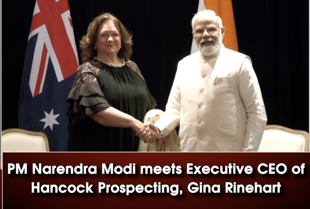 Prime Minister Narendra Modi met Executive Chairperson of Hancock Prospecting, Gina Rinehart in Sydney on May 23. Hancock Prospecting has a long history in the iron ore sector in Australia. Earlier, PM Modi met CEO of Australian Super Paul Schroder in Sydney on May 23. In the year 2022, India signed a historic trade deal with Australia. Notably, Prime Minister Narendra Modi is on a three-day visit to Australia. He arrived in Sydney on May 22.
